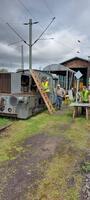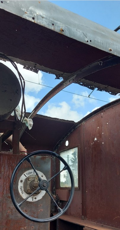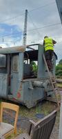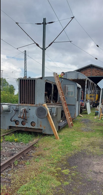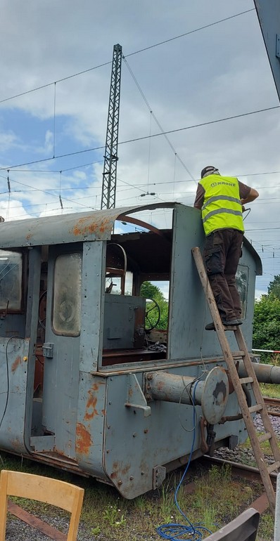 Es wird geschliffen, entrostet, grundiert und auch Bleche werden zugeschnitten und montiert, um das schadhafte Dach der Lok auszubessern.
